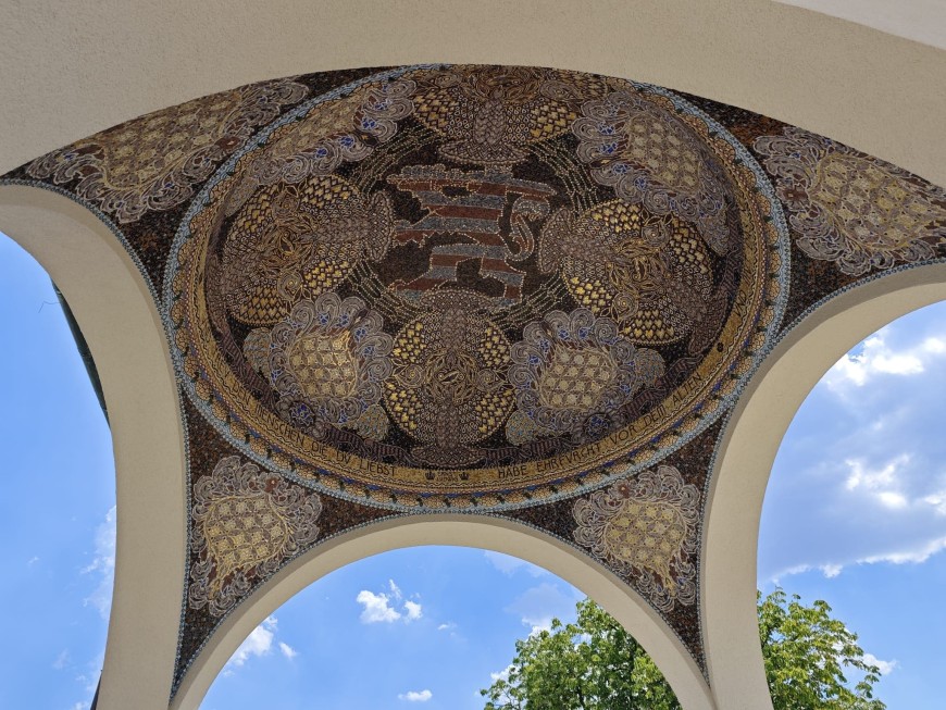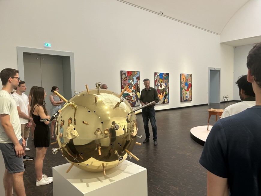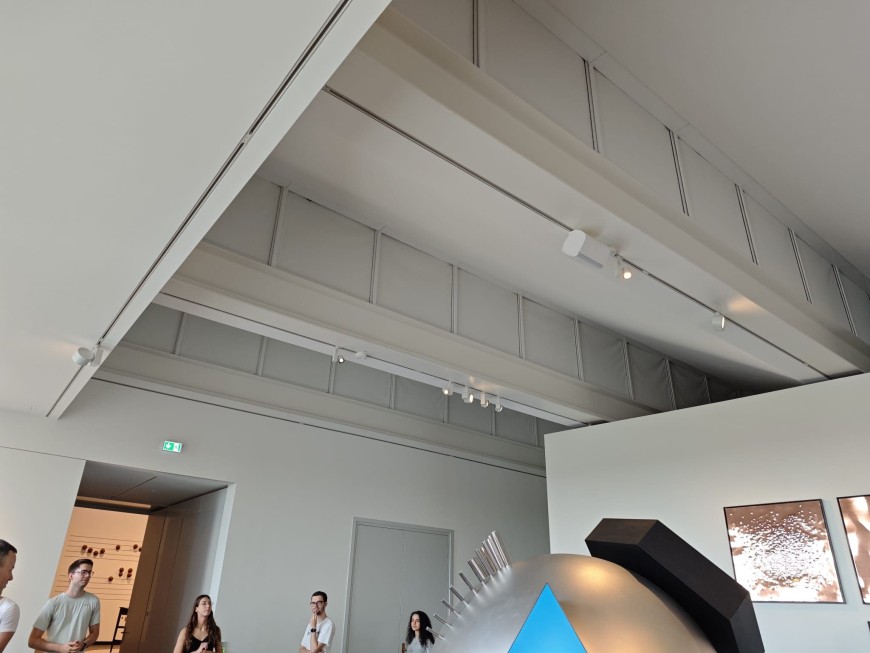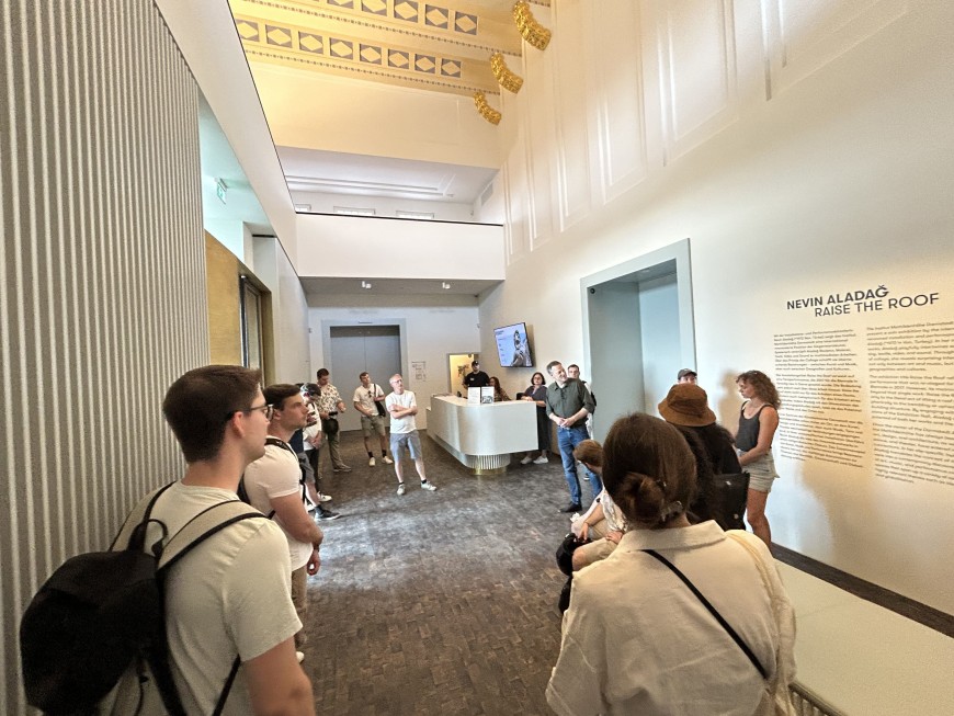 We saw the historic water reservoir in the basement, whose overlapping vaulted structure is an impressive example of vaulting art. The water circulation in the reservoir keeps the temperature and humidity in the exhibition building constant over the years. During the most recent renovation, the circulation system was upgraded with new technologies. At the same time, the outer wall of the masonry structure was covered with a new thermal insulation material called aerogel. All of this ensures a pleasant indoor climate. Especially during the heat wave and with an outside temperature of 35 °C on the day of our visit, the temperature difference and comfort in the exhibition building compared to the outside was clearly noticeable. We then visited the interior of the exhibition building, learned about the renovation and reinforcement of the roof structure, and received interesting information about the building's history, architectural background, and the exhibited works of art.